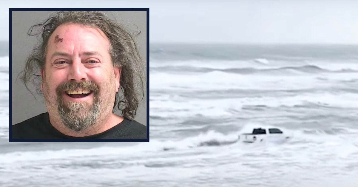 Jason Brzuszkiewicz allegedly drove his car into the ocean. Inset: Jason Brzuszkiewicz mug shot (images via Volusia County Sheriff’s Office)